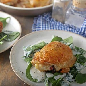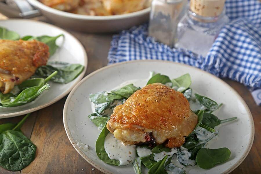 Take a bite of these crispy, skillet fried, boneless chicken thighs. We’ve pared them with wilted greens that are wrapped up in a thickened cream sauce. No extra carbs to worry about here though, since the traditional roux has been swapped for a coconut flour version. You will be pleasantly surprised by how well this works!